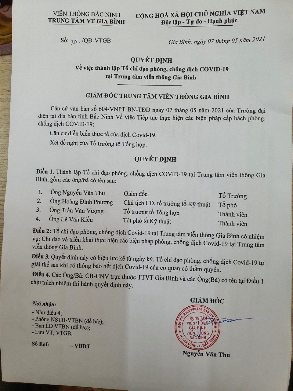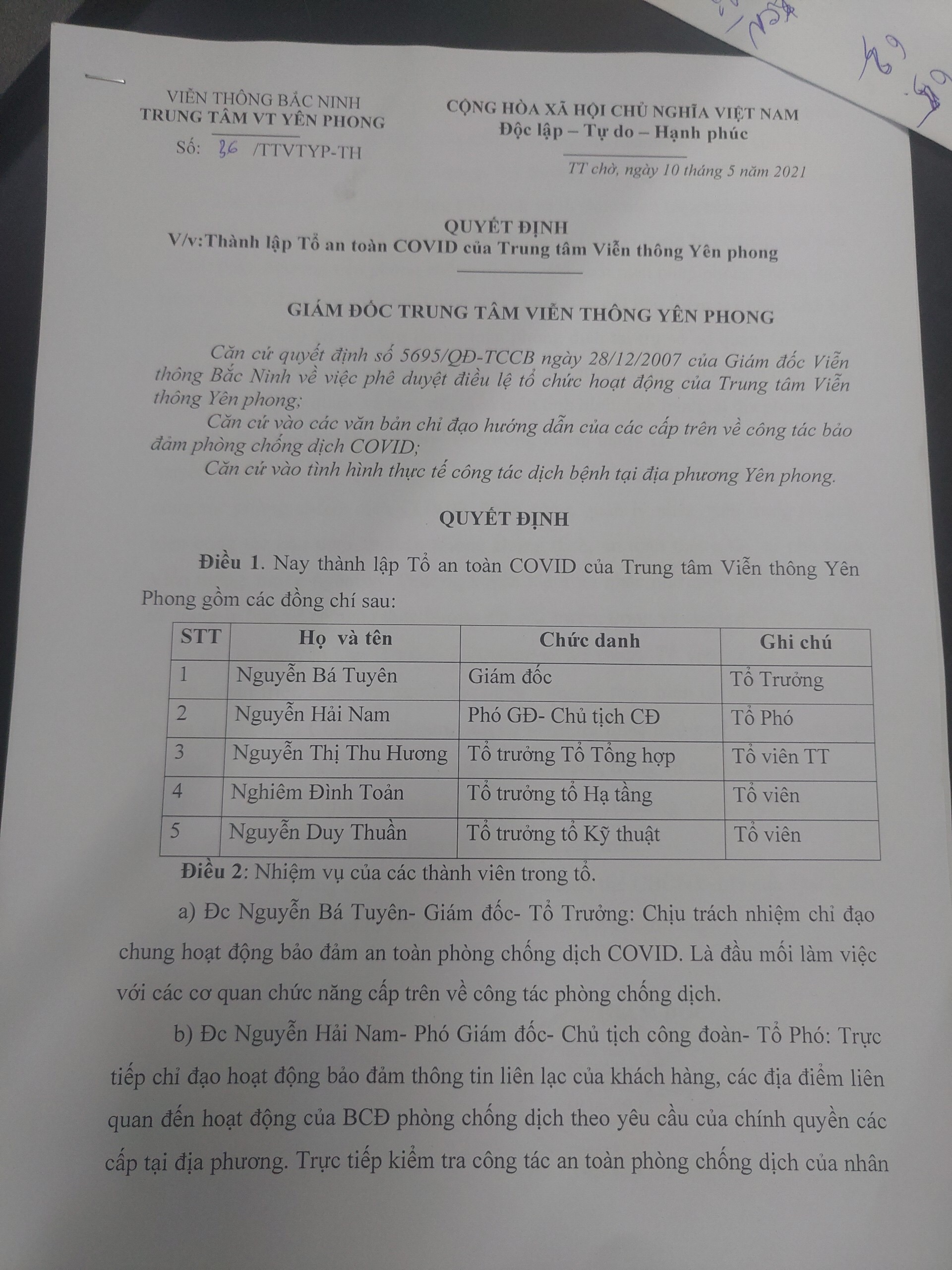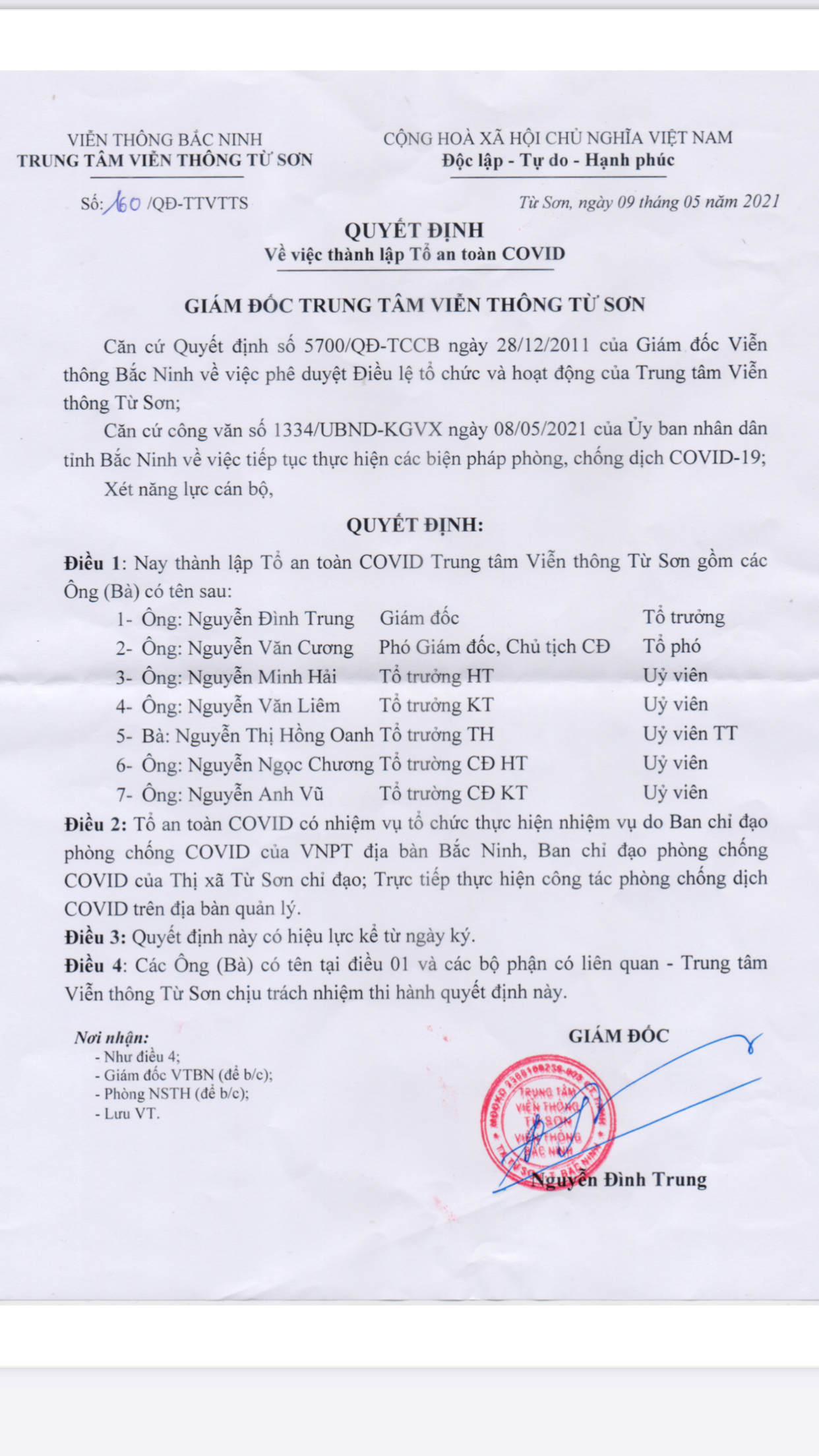 QĐ thành lập tổ an toàn COVID trung tâm viễn thông Từ Sơn