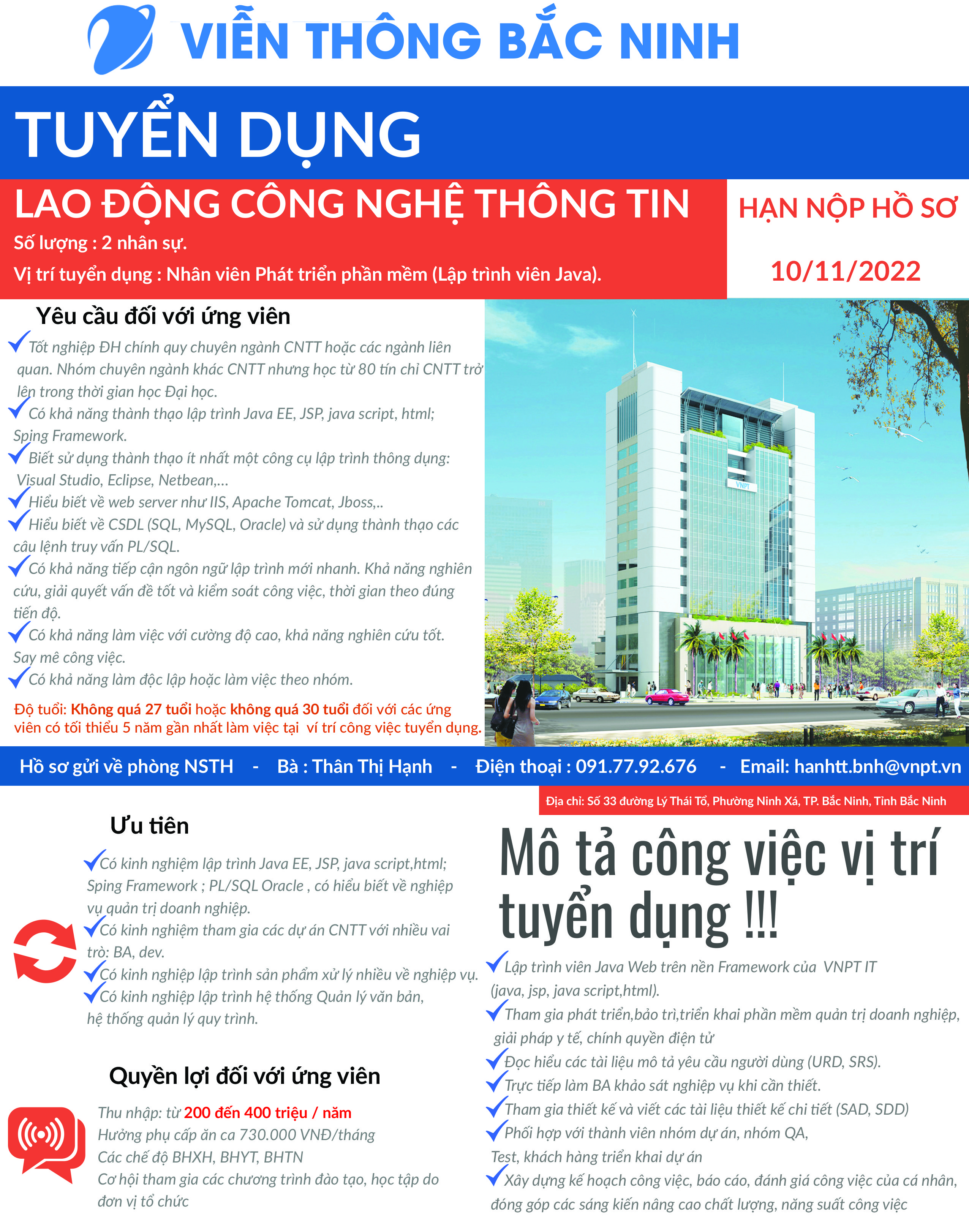 Đầu mối lên hệ: Thân Thị Hạnh, Điện thoại: 0917792676/0222.3854199, email: hanhtt.bnh@vnpt.vn. Phòng Nhân sự -Tổng hợp Viễn thông Bắc Ninh