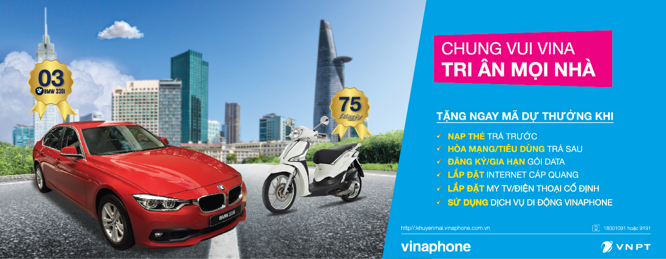 Tin vui đã đến với thuê bao VinaPhone ngay từ đầu năm 2017 này khi nhà mạng chính thức trở thành 1 trong 10 thương hiệu viễn thông hàng đầu Đông Nam Á. Tri ân khách hàng đã đồng hành cùng VinaPhone chinh phục thành tựu ngoạn mục này, nhà mạng sẽ tổ chức chương trình khuyến mại bom tấn Chung vui Vina – Tri ân mọi nhà. Trong chương trình này, tất cả khách hàng của VinaPhone sẽ có cơ hội nhận được 75 xe máy Liberty ABS cùng 3 siêu xe BMW 330i với tổng trị giá hàng chục tỷ đồng.